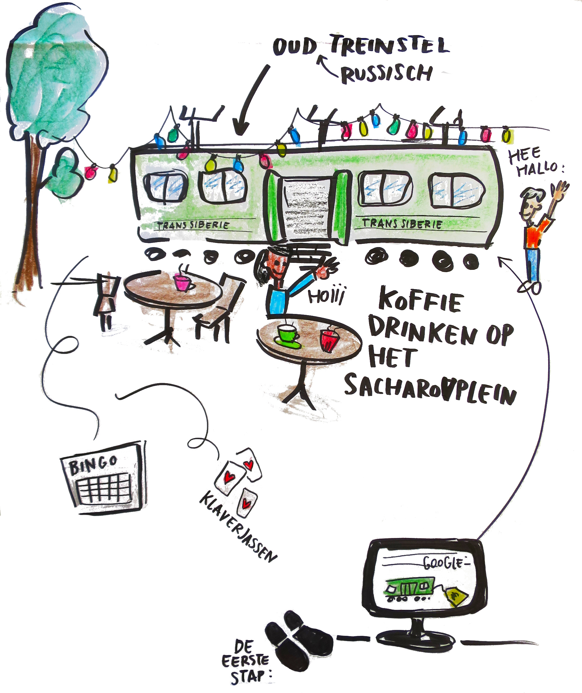 De droom is dat we een ontmoetingsplek hebben, een oude Russische treinwagon op het Scharovplein. We kunnen het gebruiken als koffiehuis, om te klaverjassen, een bingo te doen etc. Het kan ook gebruikt worden door het Sociaal Wijkteam voor verbindende activiteiten. Doordat men elkaar kent is men eerder bereid elkaar te ondersteunen en op te zoeken.
